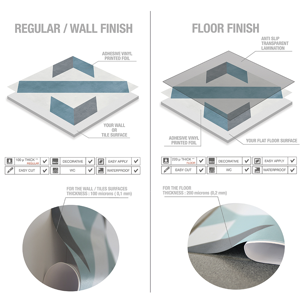 Made of 100% Quality German vinyl and covered with a special protective layer that prevents scratches and damages to the decal (in Floor Graphics option).