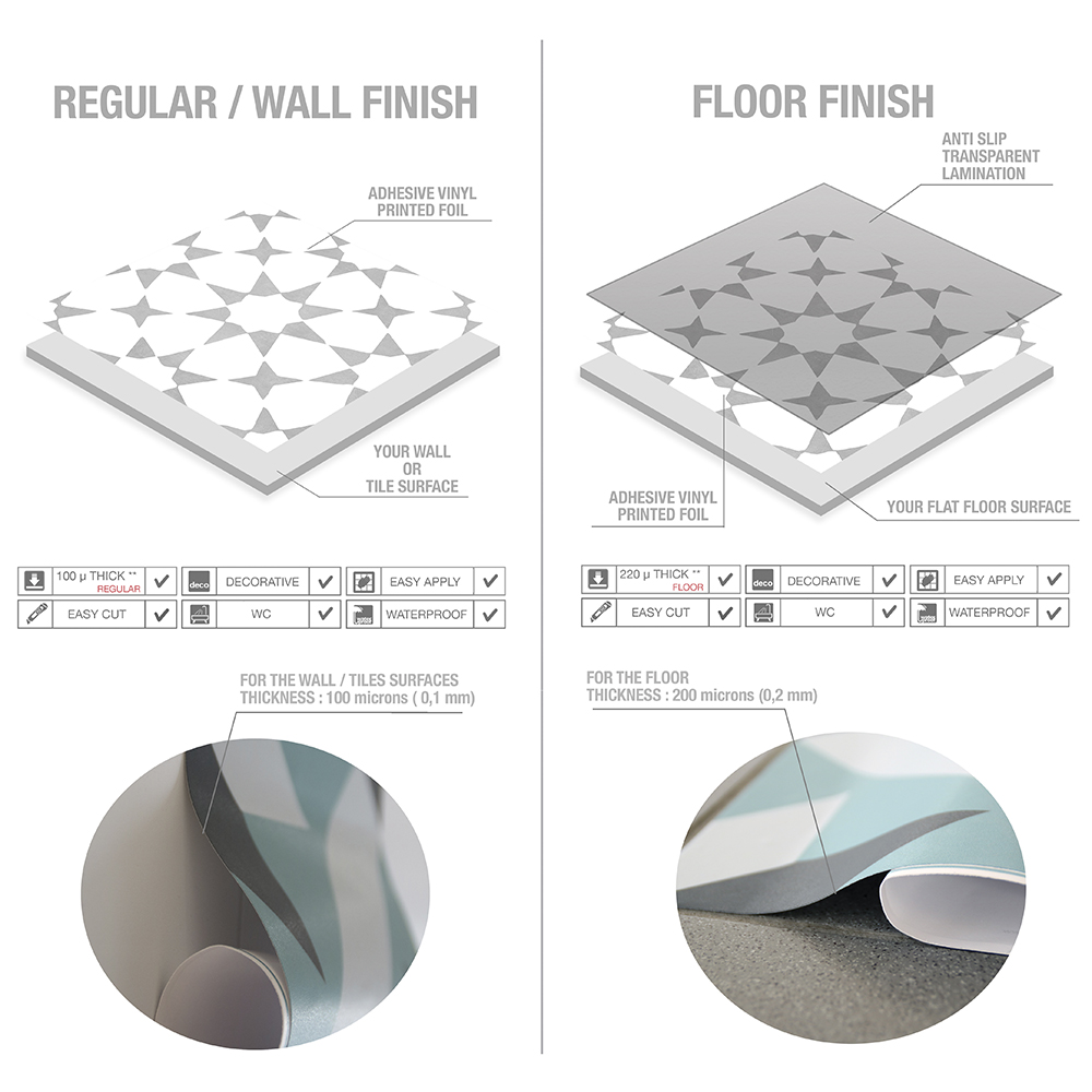Made of 100% Quality German vinyl and covered with a special protective layer that prevents scratches and damages to the decal (in Floor Graphics option).