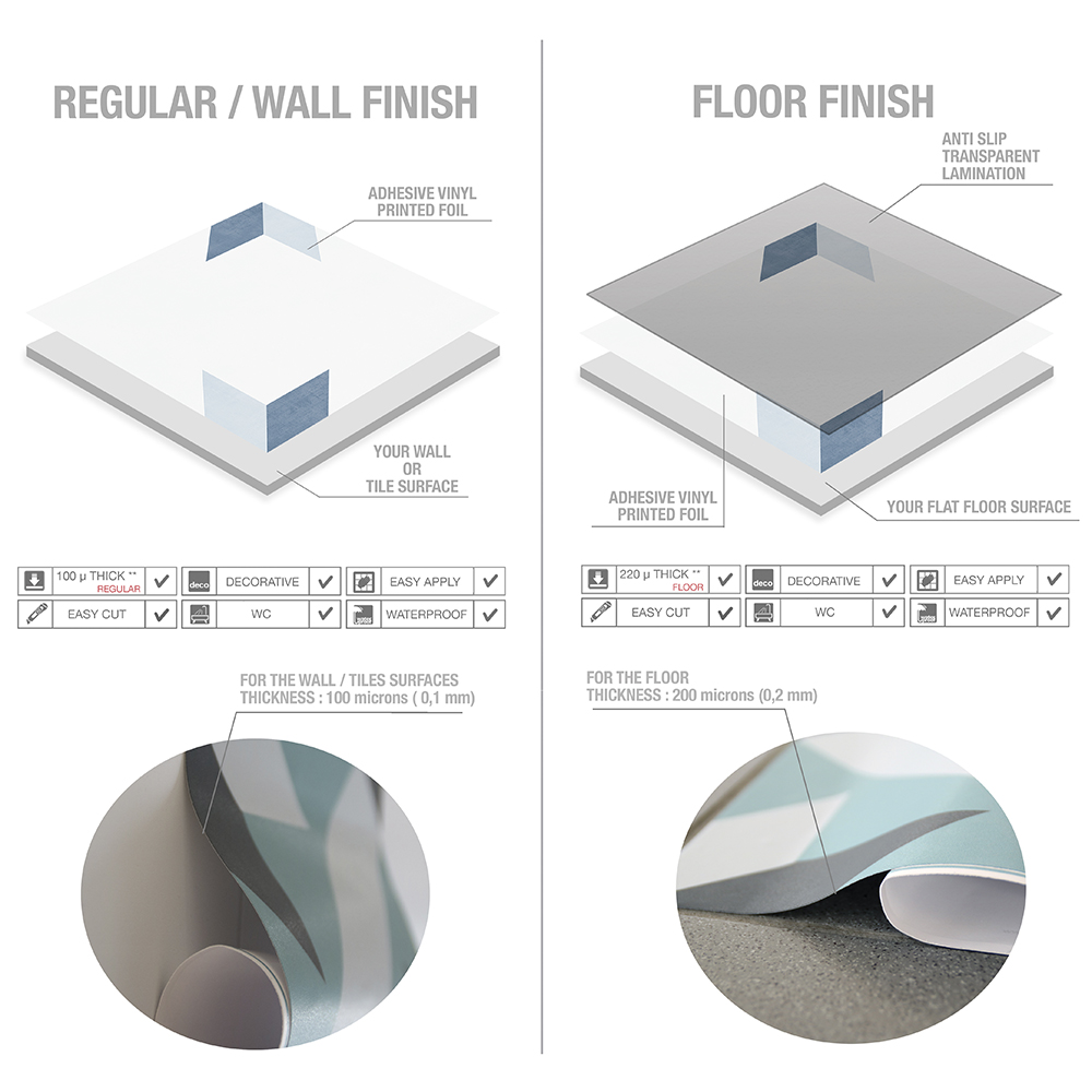 Made of 100% Quality German vinyl and covered with a special protective layer that prevents scratches and damages to the decal (in Floor Graphics option).