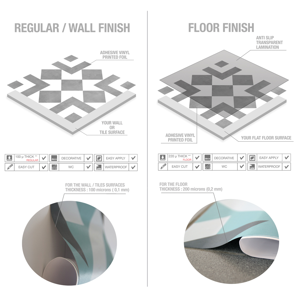 Made of 100% Quality German vinyl and covered with a special protective layer that prevents scratches and damages to the decal (in Floor Graphics option).